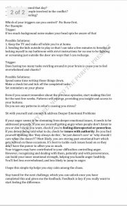 The plan also comprised of example situations and suggestive conversations that helped parents understand how to deal with situations better. These short scenarios helped parents see their situation from a third person perspective and understand the consequences of their behavior.
