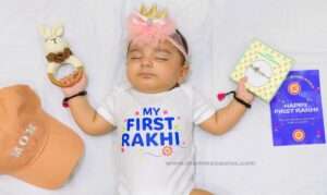 The moment I tied that tiny rakhi to her wrist, it all came rushing back—years of tying the thread on her father’s wrist, of getting angry over his incomplete homework, brushing his hair, calming his fears. Now, he stood beside me, watching his daughter be welcomed into this tradition. The rattle had her giggling, the onesie made her look like a tiny marshmallow, and I… I felt overwhelmed with love. Isn’t she a sight to swoon over?!
